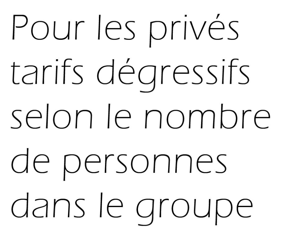 Première heure de cours à CHF. 70.-- rabais par module de 8h00 payable à l’avance CHF. 63.-- de l’heure (10% de rabais). Par période minimale de 2h00 à la fois (à raison d'1x par semaine).